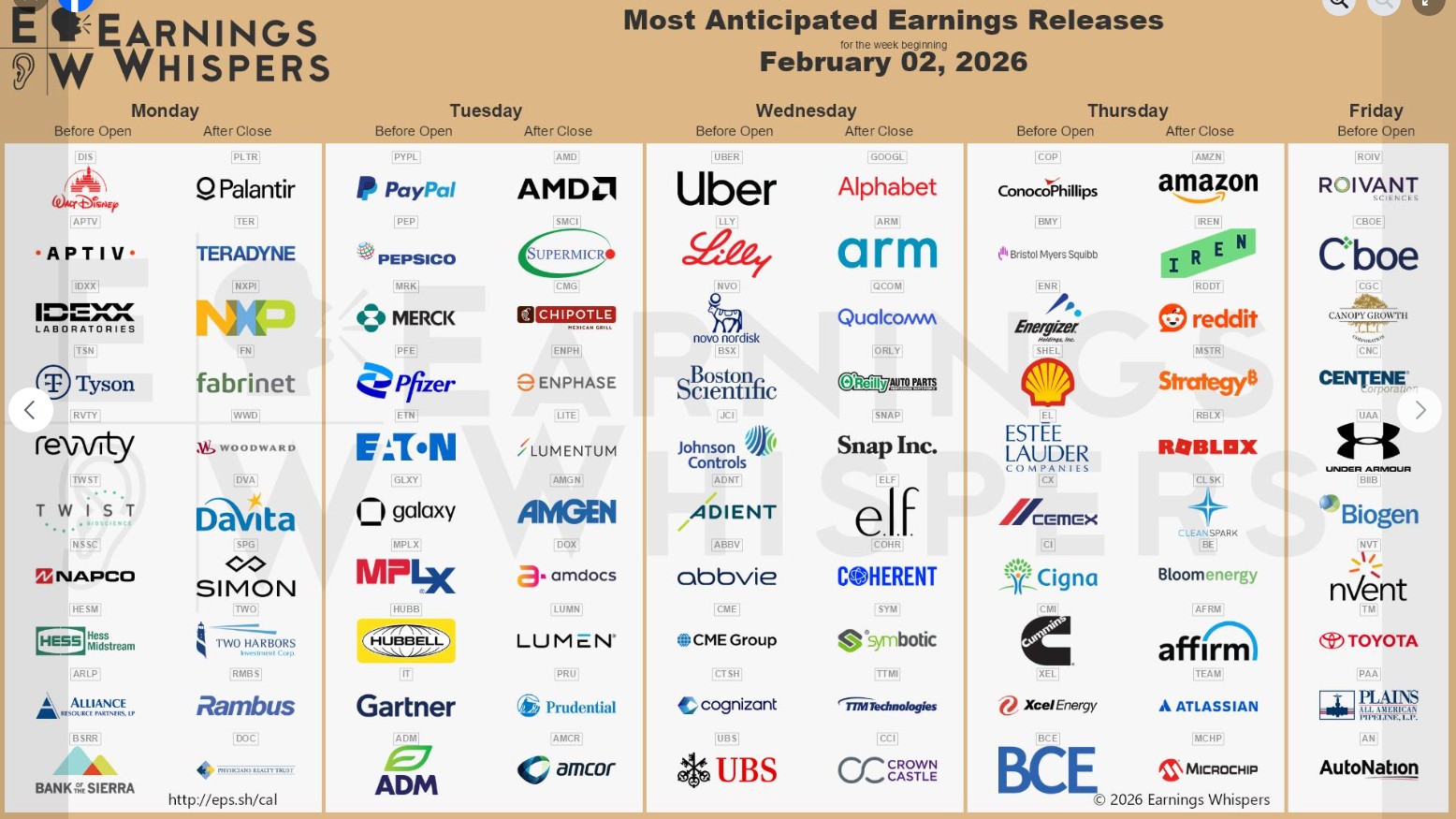 | PLTR | Palantir Technologies Inc. | 02.02.2026 00:00 | 02.02.2026 16:05 | AMC | Yes | 37.689.124.563,00 | http://investors.palantir.com | 0.104 | 0.1428 | 46008247.7939 |